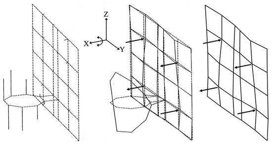 In Figure 9, the backboard flexed in a dome-like deformation along the X direction (my = 1, mz = 1) at a higher frequency, 78.14 Hz. This dome-like deformation of the backboard is similar to Irvine’s Figure 3 [7] for a plate point supported at each corner, which also had an aspect ratio of 1.5:1. The same plate point-supported boundary condition was consistent with modes 3–4, in Figure 7 and Figure 8, above. The backboard appeared to have its four corners constrained by the Hydra-Rib mount. The rim itself was now flexing in a more complicated mode shape, similar to the second mode of flexural vibration of a beam.