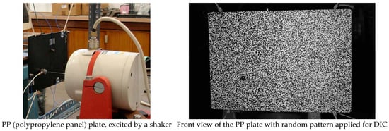 The vibration of a polypropylene panel (Sabic Stamax 30YM240) with dimensions of 260 mm × 180 mm × 3 mm, which was slightly curved, was captured using two high-speed CMOS cameras. The panel, which is illustrated in Figure 1, was suspended using four ropes to mimic free boundary conditions. A stinger linked a shaker to the plate, and random excitation in the range of 0–512 Hz was administered. The two high-speed cameras captured transient images at a speed of 1000 frames per second. Images were taken for approximately 4 seconds, resulting in 4004 steps. A DIC algorithm was implemented in the Dantec Dynamics software Istra 4D V4 to estimate the transient displacement from each pair of stereo images. This process generated approximately 2320 data points, also referred to as subset or facet centres, at each temporal step. Furthermore, the force applied by the shaker was recorded during the experiment.