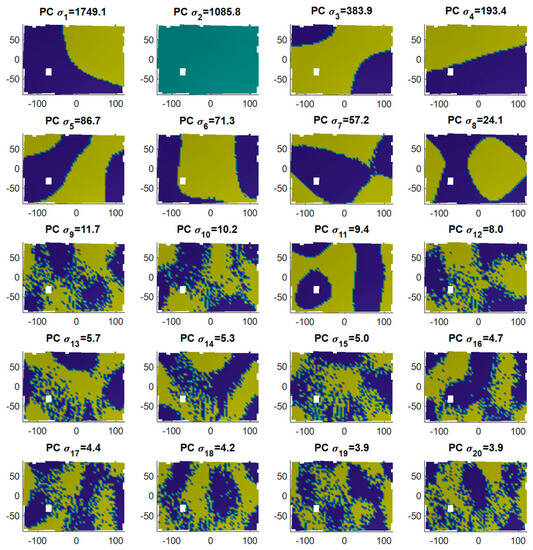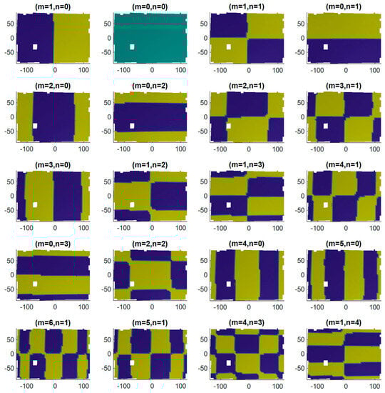 Alternatively, it is possible to construct basis functions on the measured domain (rather than the data itself) using elementary mathematical functions. In this case, a set of two-variable monomials can be defined within the domain of the digital image correlation (DIC) measurements, spanning from zero to ten orders in both variables. To ensure orthonormality, the Gram–Schmidt approach was employed between each monomial. Figure 4 shows 20 of these data-independent basis functions. Notably, these basis functions exhibit a more regular pattern and are less prone to spatial noise compared to the data-dependent basis functions obtained through singular value decomposition (SVD).