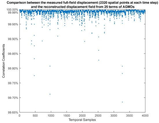 Figure 5 illustrates a comparison between the full-field displacement obtained from digital image correlation measurements and the reconstructed displacement field using only 25 terms of the data-independent shape descriptors AGMD. The DIC measurement provides displacement data at 2320 spatial points for each time step. The correlation between the reconstructed displacement field and the DIC measurements is evaluated for each temporal step. The obtained correlation values exceed 99.65% for all steps, indicating a strong agreement between the two datasets. Moreover, most correlation values are greater than 99.99%, indicating an excellent match between the reconstructed displacement field and the DIC measurements.