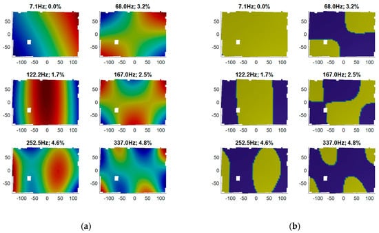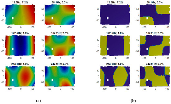 By Equation (17), it is observed that using only 20 PC features captures over 99.999% of the nucleus norm of the data matrix. The resulting modal properties effectively represent the full-field mode shapes, as demonstrated in Figure 6. Notably, six modes have been identified within the frequency range of 0–350 Hz, with consideration that the random excitation spanned 0–512 Hz. Figure 6a shows the reconstructed full-field mode shapes comprising 2320 data points for each pattern using the 20-term feature mode shape described in Equation (24). The identified natural frequencies and damping ratios are indicated in the titles above each mode shape pattern. Conversely, Figure 6b shows the same mode shapes, emphasising only the nodal lines and deflection signs (yellow in one direction, blue in the opposite).