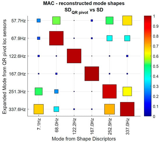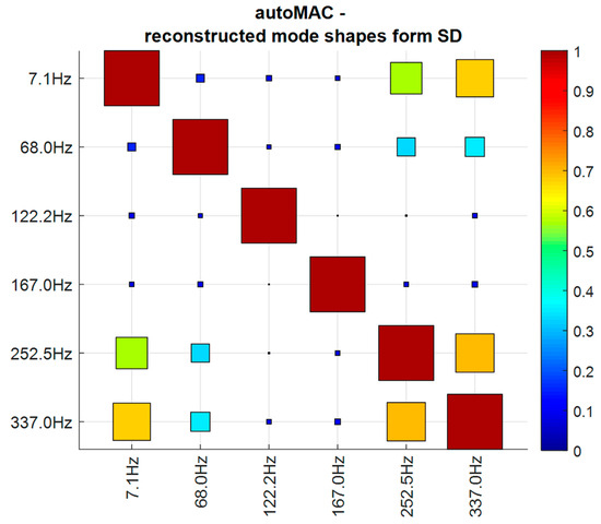 Figure 9 shows the autoMAC plot, comparing the full-field mode shapes reconstructed from the low-dimensional feature mode shapes. The plot demonstrates a clear diagonal unity grid, indicating a high level of agreement among the identified mode shapes. It confirms the reliability and accuracy of the mode identification results obtained from AGMD features.