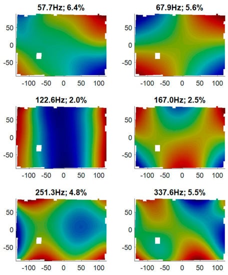 To simulate a “free–free” boundary condition, the plate was constrained by four ropes at its corners. Based on the plots in Figure 6, the first and second horizontal bending modes can be observed at 122.5 Hz and 253.1 Hz, respectively. Additionally, the first, second, and third twisting modes are observed at 68.1 Hz, 167.2 Hz, and 342 Hz, respectively. However, the mode at 12.3 Hz does not exhibit clear deformation or nodal lines. It is plausible that this mode corresponds to a pseudo-rigid-body mode associated with the constraints/boundary conditions imposed by the four ropes.