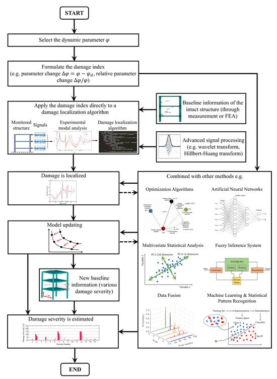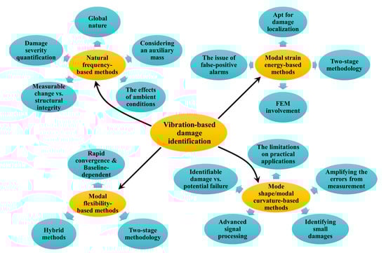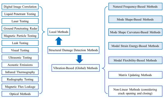 Detecting the occurrence of damages, identifying their locations, and determining their severities are the three steps involved in damage assessment. These steps can be facilitated through different types of non-destructive testing (NDT) [1], such as visual inspection, digital image correlation, ultrasound, acoustic emission, magnetic field, eddy current, thermography, and radiography tests, to name a few. However, typically, these experimental techniques are local methods (as shown in Figure 1) [2], only able to inspect a limited region at once; hence, several measurements must be taken to inspect a structure or for inspection focused on specific regions. Such NDT techniques also require that the portion of the structure being inspected is readily accessible [3,4,5]. The need for quantitative global damage detection without prior knowledge of damage location has prompted the development of two global methods. One is based on the measurement of static deflections [6,7,8], and the other is to examine changes in vibration characteristics of structures, i.e., vibration-based damage detection methods, as shown in Figure 1. In the vibration-based method, damage detection can be fulfilled by examining changes in measured vibration response, where the modal parameters (natural frequencies, mode shapes, and modal damping) are functions of the physical properties (mass, damping, and stiffness) of a structure [9]. Therefore, changes in structural properties will result in changes in modal properties, which can either be detected absolutely or more often with reference to an undamaged state.