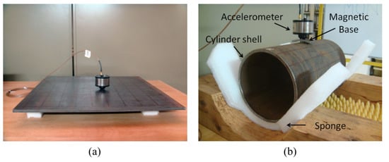 Natural frequency is a global dynamic parameter that normally contains limited spatial information of damage. Thus, an auxiliary mass has been used to draw spatial information from a frequency shift [19]. Zhang et al. [20] presented the frequency shift surface method, which was essentially roving an auxiliary mass on a plate and measuring the frequency with the mass at different positions. The damage was modeled as a local thickness reduction. The advantages of using the frequency shift surface are that, firstly, the frequency shift surface is related to the mode shape squared; thus, it contains spatial information of damage. Secondly, frequency measurement is usually easier and less susceptible to noise compared with mode shape measurement. In the experiment, a steel plate with a central thickness reduction was tested. The steel plate was supported by sponges to approximate free boundary conditions (see Figure 2a). A 0.3 kg accelerometer was considered as the auxiliary mass. The damage was identified using the fundamental frequency shift surface. An observation of this approach is that if the plate is large, more measurement points would be required to maintain the same spatial resolution, and the experiment could be time-consuming.