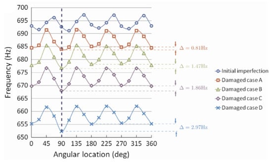 Subsequently, a similar method was applied to a damaged steel cylindrical shell [21]. By changing the location of the auxiliary mass around the circumference of the cylindrical shell (see Figure 2b), the frequency shift curve was obtained, and the lowest trough on the curve indicated the damage location. In the experiment, thickness reduction was made on the inner surface of the shell. It is interesting to observe the difference between the lowest trough and other troughs on the frequency shift curve for each damage case in Figure 3. When the area of thickness reduction was large, the frequency difference was 2.97 Hz. However, when the area of damage was small and did not cross the trajectory of the mass, the frequency difference was 0.81 Hz. The frequency difference could be even smaller if the damage were not severe. The methods in [20,21] deserve further study to see how the frequency curves behave when there are multiple damages. Moreover, whether the presence of measurable frequency shifts implies that the damage is already too severe or if the structure is amenable to repair is a question that has not been addressed.