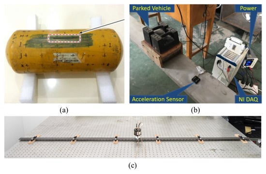 The experiments in [22,23,24]: (a) the CNG cylinder containing a crack [22], (b) the experimental set-up in [23], (c) the experimental set-up in [24].