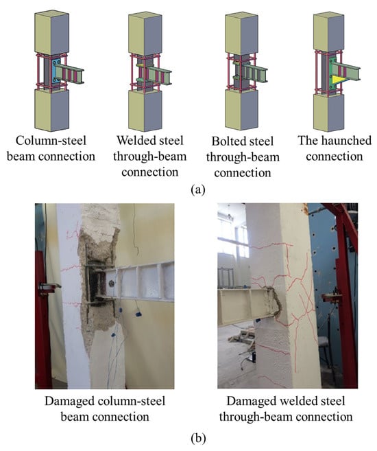 Concrete-encased composite column-beam connections [50]: (a) four different connections and (b) damaged samples after cyclic loading test.