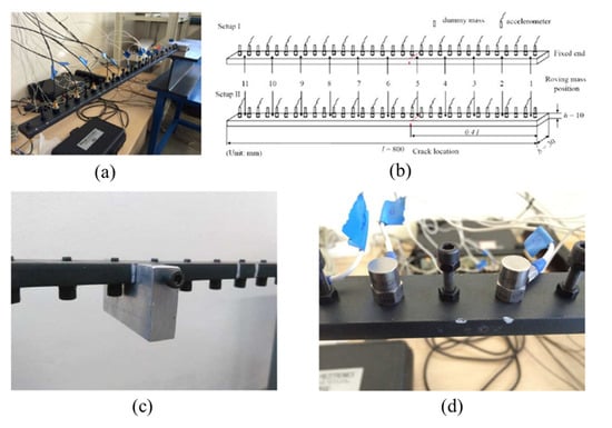 The experimental set-up in [56]: (a) the experimental set-up, (b) the scheme of the tested beam, (c) the roving mass, (d) the accelerometer and the dummy accelerometer masses.