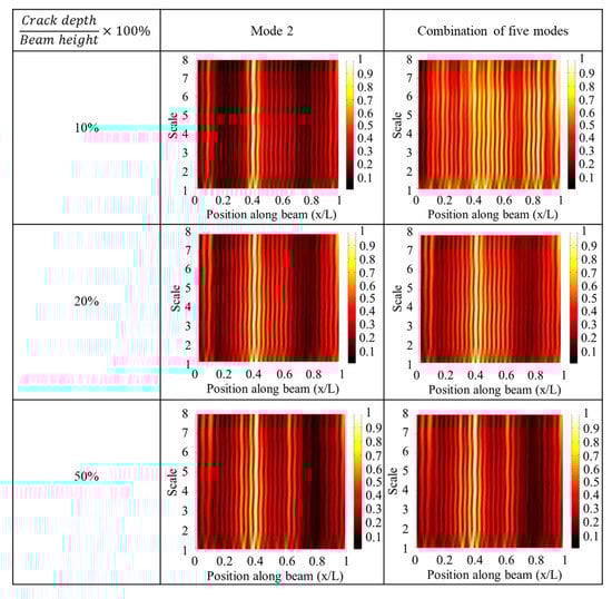 The authors of [56] demonstrated that the less noisy mode shape (mode 2 in this experiment) provided a more reliable result for damage detection (see Figure 9, and the crack is at 0.4 L). However, local peak values of the wavelet coefficient due to noise can be observed at different measuring points (as indicated by the bright stripes in Figure 9), and they can easily mask the perturbations caused by a small crack. When locating a small crack, using the summation of wavelet coefficients of all mode shapes (without proper selection beforehand based on sensitivity) may not be advisable because the noise effects from all mode shapes could potentially accumulate and further mask the crack.