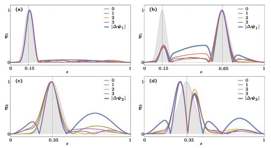 Modal damage shapes reconstructed from the analytical approximation for an increasing number of terms in the series [60] for (a) the first mode and a damage located at 0.15 and width 0.1; (b) first mode and two damages at 0.15 and 0.65 with widths 0.2 and 0.3, respectively; (c,d) second and third modes and damage at 0.35 and width 0.4. Grey areas represent the actual damage shape . Continuous lines represent the absolute values of modal curvature variation (thick blue line) and approximated modal damage shape, respectively.