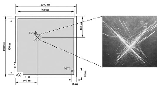 The 2D modal curvature has been used to detect non-uniform damage in metal plates [79,80]. Analogous to the method proposed in [66], the TEO-WT modal curvature of a plate was taken as the damage index in [79]. The FE model of the plate consists of two layers, and a through-thickness crack was introduced to the first layer. In the experiment, an X-shape notch was made on an aluminum plate (see Figure 11) under completely free boundary conditions, practically achieved by hanging the plate with two strings. The thickness of the plate was 4 mm, and the depth of the notch was 1.2 mm. Thus, the notch only caused insignificant variation in natural frequencies. By using the TEO-WT modal curvature, the damage was identified successfully. However, to avoid the influence of abnormal wavelet coefficients caused by boundary distortion, the wavelet coefficients around boundaries were discarded, which means only the grey area, as shown in Figure 11, was analyzed. Thus, the method was not capable of identifying any damage near boundaries.