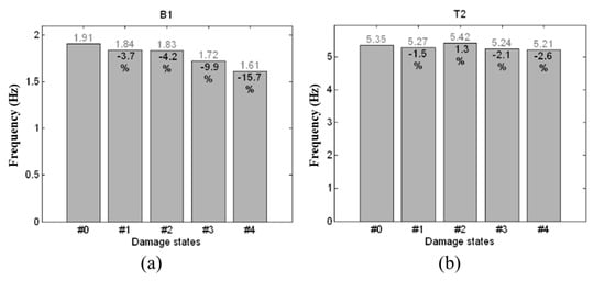 - The damage-induced frequency changes may be veiled by the frequency changes due to other factors such as the effects of ambient conditions (e.g., temperature, humidity, wind, rainfall, etc.), operating loads, and possible evolution of boundary conditions. It has been reported in [25,26,27,28] that the frequency variation due to such environmental and operational factors is usually of the order of 5–10% but can exceed this. Currently, most successful frequency-based damage detection methods are verified only under controlled laboratory conditions rather than exposed to variations in environmental or operational effects. In practical applications, damage-induced frequency changes should, as a minimum, be expected to exceed 5% to detect the damage with confidence.