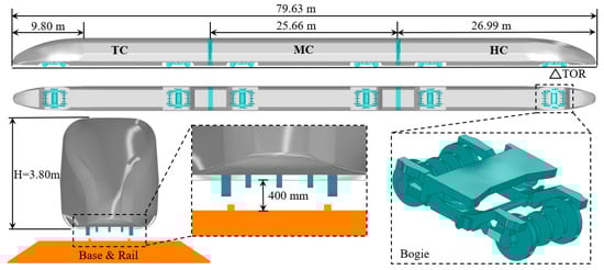 This study focuses on the Chinese domestically developed HST CR400BF. The aerodynamic numerical simulation is conducted using a three-car formation consisting of a head car (HC), an intermediate car (MC), and a tail car (TC). The HC and TC each have a length of 26.99 m, with a streamlined portion of 9.80 m, while the intermediate car has a length of 25.66 m. The entire length of the three-car train is 79.63 m, and the characteristic height (H) is 3.80 m. Each vehicle’s chassis includes two bogies that provide support and guidance. The bottoms of the bogies form the base and rail. The lowest point on the train body is raised 400.00 mm above the top surface of the base, which is identical to the height utilized in wind tunnel tests and related experiments. Some complicated surface structures and pantographs have been eliminated for clarity. The car-end connection adopts a full-cover windshield (Figure 1). depicts the geometric model for the HST’s aerodynamic numerical simulation.