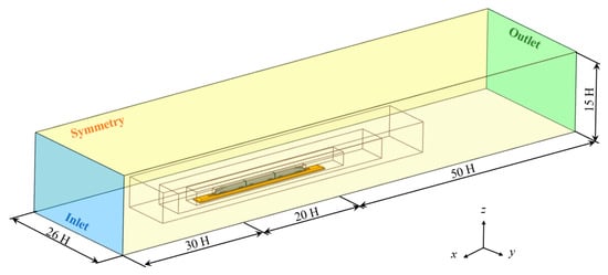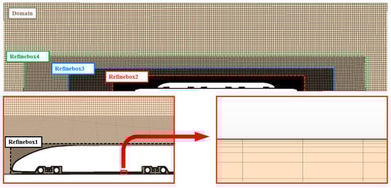 Figure 2 illustrates the outer flow field region for the aerodynamic numerical simulation of the HST. Apart from the base and rail established at the bottom of the computational domain, the remaining boundaries consist of the inlet, outlet, ground, lateral sides, and top. The computational domain is defined based on the train’s characteristic height H, extending 100 H in the x-direction, 26 H in the y-direction, and 15 H in the z-direction. The Inlet boundary at the front of the HC is set to free-flow conditions with a Mach number of 0.3268, corresponding to an inlet velocity of 400 km/h. The Outlet boundary is identical to the Inlet boundary with a combined velocity Uinflow of (−111.11 m/s, 0, 0), where the negative sign indicates that the airflow is in the opposite direction to the train’s motion. The computational domain’s lateral sides and top are defined as symmetric boundaries, whereas the ground, base, and rail are classified as moving walls to eliminate ground effects []. The magnitude and direction of the velocity are the same as the input velocity. To ensure a smooth transition of grid cells and improve grid quality and simulation accuracy, four layers of refinement zones are placed around the train, preventing divergence of results caused by abrupt changes in grid scale during the computation process.
