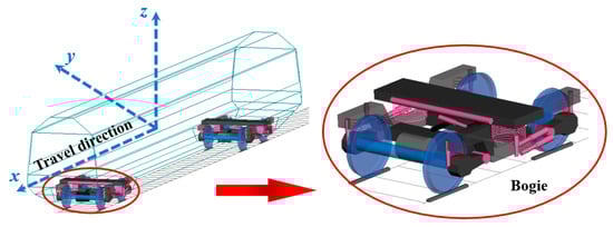 The multibody dynamics model of an eight-car formation of the HST consists of four motor cars and four trailer cars. Each vehicle is composed of one car body, two bogies, eight suspension arm axle boxes, and four wheelsets. Additionally, each motor bogie includes an extra traction motor. Elastic deformations of the rigidly coupled system formed with these components are neglected. Among the mentioned components, only the suspension arms apply rotational joints around the x-axis, representing only the pitching degree of freedom. The carbody and bogies account for six degrees of freedom in total, considering longitudinal, lateral, vertical, roll, pitch, and yaw directions. The vehicle system is simplified into a multi-rigid-body system with 50 degrees of freedom. The train formation follows the pattern of “motor-trailer-motor-trailer-trailer-motor-trailer-motor”. Connections between each railcar are established using force elements to simulate simplified coupler forces and inter-car windshield forces. The overall HST model has a total of 400 degrees of freedom. For the suspension system components, a first-stage suspension system is established between the wheelsets and bogies, while a second-stage suspension system is established between the bogies and carbody. The motor car model also includes a traction motor suspension system. All dampers in the model are simulated using series-connected spring-damper units, and input functions are configured to simulate the nonlinear characteristics of damper damping and lateral stoppage forces. The final dynamic model of the train is depicted in Figure 3, a loaded measured track spectrum from a specific location in China to account for track irregularities, including lateral and vertical excitations.