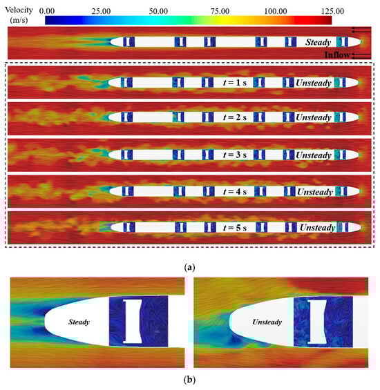 Comparison of steady/unsteady flow field velocity contours around the train: (a) cross-section velocity line integral convolution at z = 0.8 m; (b) velocity flow field around TC nose and bogie region.