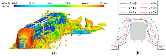 Comparison of steady/unsteady aerodynamic characteristics of HST: (a) Vortex core distribution (Q = 500 s−2); (b) cross-section velocity boundary layer at x = −24.87 m.