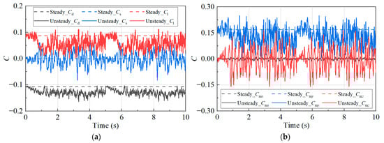 Steady/unsteady aerodynamic loads of TC: (a) aerodynamic force coefficient; (b) aerodynamic moment coefficient.