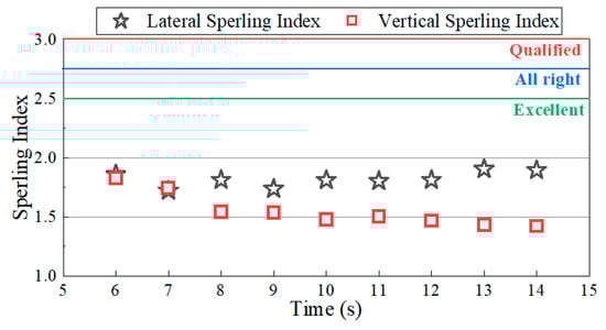 - Liu, D.; Li, T.; Meng, S.; Lu, Z.; Zhong, M. Investigating the car-body vibration of high-speed trains under different operating conditions with full-scale tests. Veh. Syst. Dyn. 2022, 60, 633–652. [Google Scholar] [CrossRef]