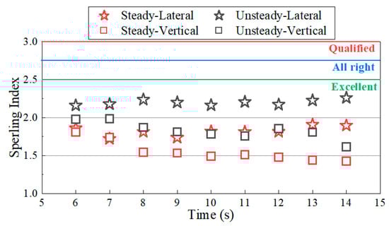 Both steady and unsteady aerodynamic loads from the CFD simulations in Section 4.1 were applied to the multibody dynamics model to simulate the train’s dynamic response. Figure 9 depicts the Sperling index for various aerodynamic loads. When the steady aerodynamic loads are applied, the impact on the stability of the TC is minor. The index values and time change trends almost coincide with those without considering the aerodynamic load. The maximum lateral Sperling value remains the same as the train without aerodynamics at 1.92, and the maximum vertical Sperling value is 1.81 for the TC, all of which meet the excellent rating criteria. However, upon the application of unsteady aerodynamic loads, considerable variations in the train’s dynamic response emerge. The lateral stability of the TC exhibits varying degrees of deterioration. The lateral Sperling index of TC completely exceeds the 2.0 threshold, with the peak reaching the highest value at 2.26; this represents a substantial 17.71% increase compared to the train without aerodynamics configuration and the scenario involving steady aerodynamic loads, approaching the boundary of the rating criteria. The maximum vertical Sperling value is 1.91 for the TC, reflecting a relatively smaller increase when compared to the train without aerodynamics. As a result, unsteady aerodynamic loads have a considerable impact on lateral stability in real flow conditions, notably the car body of the TC. In contrast, the impact on vertical stability is noticeably less evident.