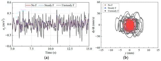 The lateral accelerations and phase portraits of the TC at the carbody rear end were extracted. In Figure 10a, the amplitude and trend under the conditions of no aerodynamic load and steady aerodynamic load are almost the same. When steady loads are applied, the lateral acceleration of the car body exhibits minimal deviation from the train without aerodynamic configuration. In this case, the lateral vibrations primarily result from the irregularities of the track, indicating that steady loads have a negligible impact. When unsteady aerodynamic loads are imposed, the lateral acceleration in the rear end of the car body experiences a significant increase. The maximum amplitudes of lateral accelerations at the rear end of the TC corresponding to the above three cases are 0.245 m/s2, 0.249 m/s2, and 0.526 m/s2, respectively; this shows that when unsteady aerodynamic loads are applied, the lateral acceleration oscillation amplitude and frequency of the rear end of the TC body increase significantly. It is more than 111.24% higher than the train without aerodynamic force. This severe vibration seriously affects the comfort of passengers and the safety of the journey.