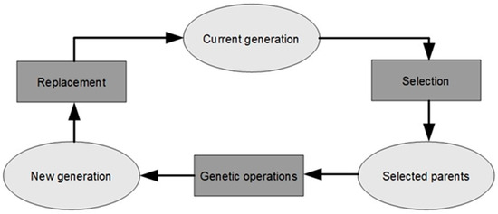 A schematic diagram of the principle of evolutionary algorithms is shown in Figure 2, which shows the typical stages of evolution, such as genetic operations, selection and population replacement, after which the population evolves.