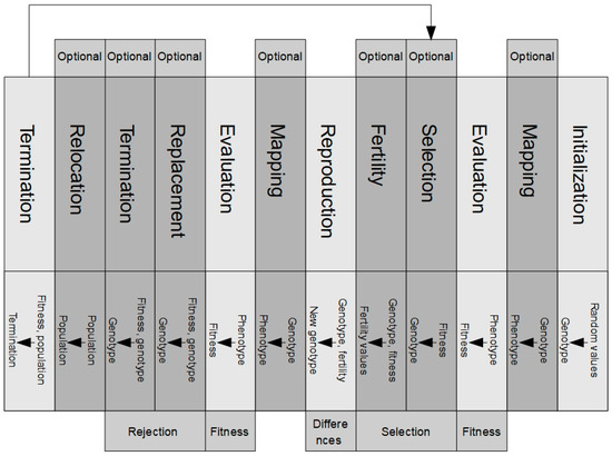 The main stages and processes of GAs are shown in Figure 3. The top shows whether the stage is necessary for the normal course of evolution and the bottom indicates the stage results of the particular step.