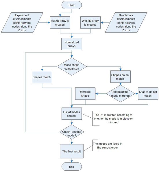The flowchart of the mode shape recognition algorithm is presented in Figure 7. The Z-coordinate lists of the reference and comparable modes are written into distinct two-dimensional arrays. Next, the arrays are normalized to eliminate the influence of offset values. Each element mesh point in the reference array is then compared with its comparable array. In the logical element of the flow “Does the mode shape match?”, an algorithm for recognizing the mode shape is encoded: if a certain number of values of a certain mode in both arrays coincide, the mode shapes are considered to be the same. If the required number of matching values is not reached, the algorithm searches for matches with the next mode in the sequence, and so on. Then it is moved on to the next mode in the reference list until all the modes necessary in the process of identifying the elastic characteristics of materials have been checked and ordered.