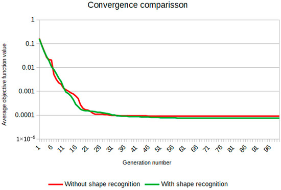 Figure 11 shows the average values of the objective function—the red curve shows the average values of the objective function in each generation without mode shape recognition, while the green curve shows the average values of the objective function in each generation with mode shape recognition. From the graph, it can be seen that mode shape recognition affects the character of convergence and the mean value of each successive population decreases smoothly. Meanwhile, without mode shape recognition, the convergence is less continuous, and sharp jumps between populations are observed.