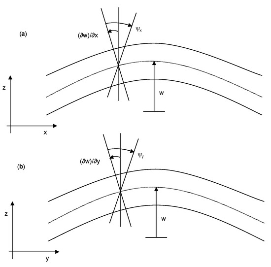 In Figure 2a,b, and indicate the angles of rotation of a normal line due to the bending of the plate with respect to the x and y axes, respectively.