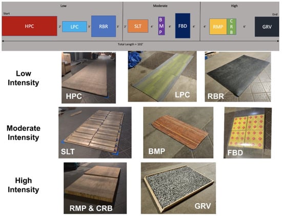 26]. However, it should be noted that these studies investigated surfaces and obstacles in isolation and did not report both RMS and VDV or WBV for multiple surfaces and obstacles in succession.