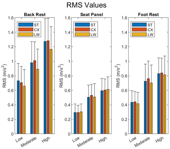 15]. The seat panel position also produced the lowest levels of WBV compared to the backrest and the footrest, which is consistent with results from other studies investigating WBV at the seat and footrest [