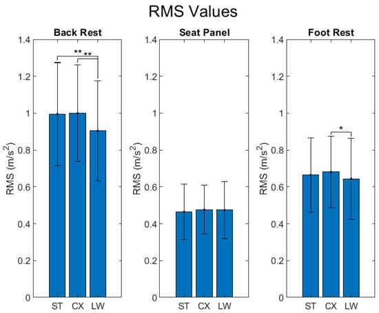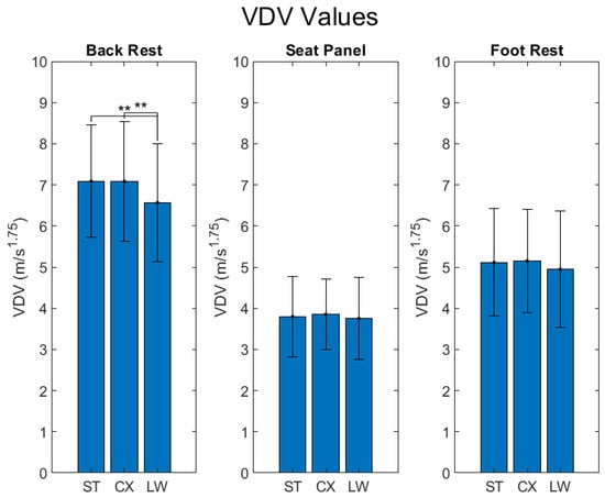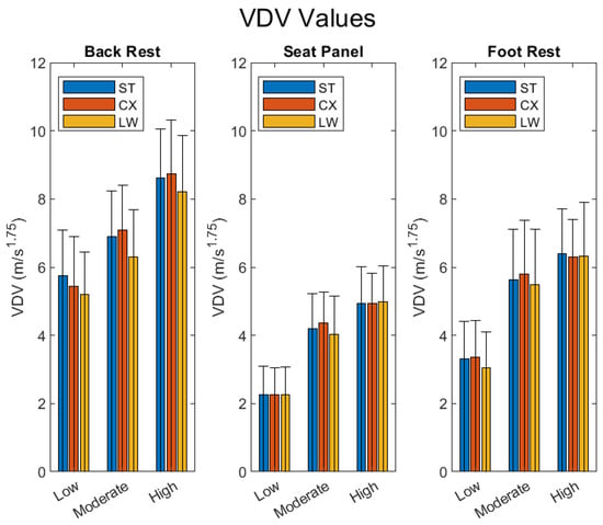 Figure 9). For the VDV values, significant differences were found at the backrest and not at the seat panel or footrest (