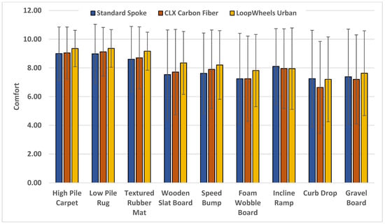 There was no significant difference in perceived comfort across wheel types (comfort scores of standard wheel: 7.88 ± 2.53, CLX: 7.83 ± 2.38, and Loopwheels: 8.19 ± 2.10). The standard deviations were also fairly small, indicating that there is not much difference in perceived comfort between different participants. However, all the comfort values were high, reflecting that there might be possible ceiling effects preventing an accurate comparison of comfort. The comfort scores for the Loopwheels were trending towards higher than the standard wheel and CLX, which resembles what was seen in another study investigating comfort with wheelchair suspension systems [