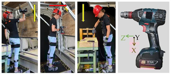 To investigate the influence of the working direction while using an impact wrench, three directions were chosen: upwards, forwards and downwards. Considering anthropometric differences, a height-adjustable experimental setup was designed to enable starting conditions that were as equal as possible in each working direction for each test person. The test persons were asked to adopt a standing posture with a 90-degree forearm angle perpendicular to the wooden plank of the test rack. Figure 1 shows an example of the test setup with a test person and the examined impact wrench.