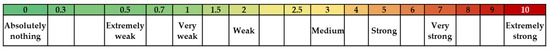 To assess the perceived exertion for the individual test sections, the modified Borg CR10 scale was used [23]. In Figure 4, the classification of the perception after being questioned: “how was the effort felt” is depicted, ranging from 0 for “absolutely nothing” to 10 for “extremely strong” is demonstrated.