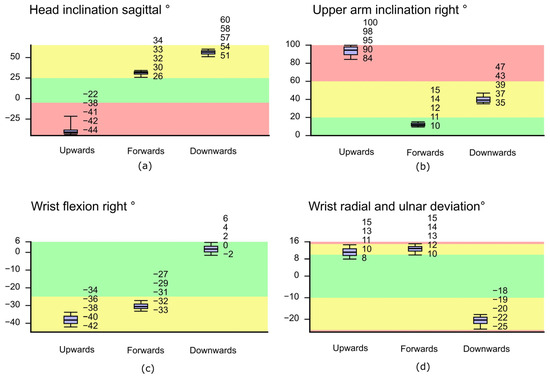 For wrist radial deviation (Figure 5d), the data was in a neutral to moderate range when working in the upwards and forwards working directions. When working in the downwards direction, however, the data differs significantly. In this direction, the wrist movement was entirely in the moderate risk category, whereby the direction changed completely to ulnar deviation.