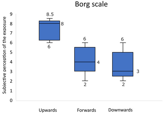 Figure 7 shows the results of the test subjects’ rating of the perceived exertion as maximum, minimum and median according to the Borg scale survey.