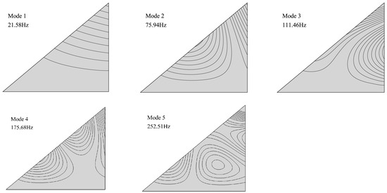 The material of the triangular wing structure is aluminum, with a density of 2700 kg/m3, a Young’s modulus of 6.9 × 1010 Pa, and a Poisson’s ratio of 0.3. The finite element modeling adopts a four-node shell element, with a total of 851 elements. The root adopts fixed boundary conditions, and the structural field calculation mesh is shown in Figure 3b. The first five modes obtained from structural finite element analysis were selected for buffet response simulation. A comparison between the calculated natural frequencies and the results in [26] is shown in Table 1, and the two are in good agreement.