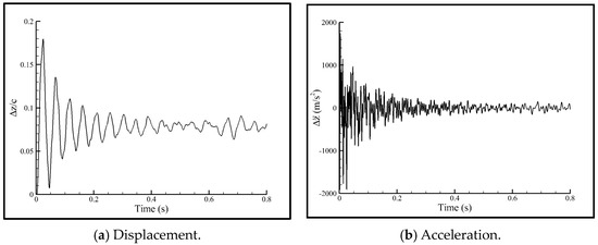 Figure 5 shows the calculated non-dimensional wing tip displacement response Δz/c and acceleration response Δ, where c is the half-span length. As shown in the figure, after a brief transition phase, a stable structural vibration response appeared, indicating that the delta wing experienced a buffet phenomenon at this angle of attack.