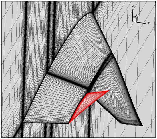 In this study, the flow field and structural response of the delta wing are assumed to be symmetric; therefore, a semi-model calculation is considered. The flow field calculation grid adopts an H-H topology structure, with a total of 6.4 million grids divided into 48 blocks for parallel calculation. Increasing the grid density of the vertex, leading edge, and trailing edge of the delta wing, and the height of the first layer of mesh near the object surface is about 1 × 10−5 m, resulting in y+ ≈ 1. The flow field calculation grid is shown in Figure 3.