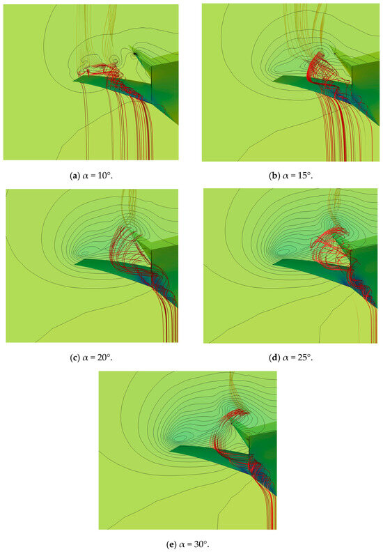 Firstly, the unsteady flow field calculation at high angles of attack was carried out for the rigid model of the variant tail, which helps to understand the mechanism of buffet response and also provides a preliminary analysis of the critical angle of attack at which buffet occurs. Figure 9 shows the instantaneous flow field at different typical angles of attack, and the results show that as the angle of attack increases, the intensity of the vortex increases, and the position of the vortex core is closer to the inner side of the fuselage. At an angle of attack of 20°, the range of immersion of the tail wing in the vortex is maximum, which is likely to induce buffet, and the potential buffet response is maximum. When the angle of attack significantly decreases or increases, the intensity of the buffet response will decrease.