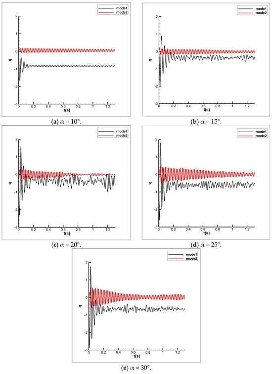 Based on the CFD/CSD coupling method established above, Figure 12 shows the generalized displacement response curves at different angles of attack. Due to the small response of the third order and above, only the calculation results of the first and second modes are shown in the figure. The period from the start to 0.2 s is the transition calculation phase of the response.