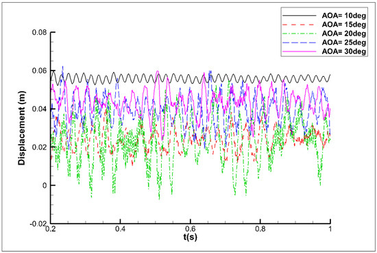 Figure 13 further illustrates the wing tip displacement response curves at different angles of attack, which provides a more intuitive view of the maximum vibration response intensity at α = 20°. For a clear comparison, the response calculation results in Figure 13 are presented from 0.2 s.