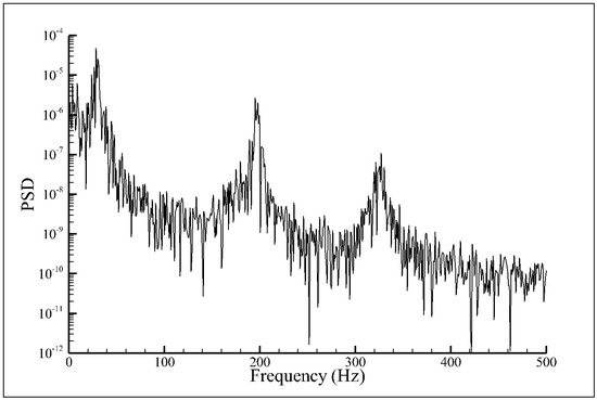 To further analyze the vibration response, a spectral analysis of the displacement response of the wing tip was conducted after stabilization at α = 20°, and Figure 14 shows the power spectral density results. It can be found that the maximum peak of the response occurs around 28 Hz, and at this angle of attack, the dominant vibration form is the first-order bending mode. The second two peaks appear around 195 Hz (third mode) and 327 Hz (fifth mode), respectively, while the peaks near other modes are very small.