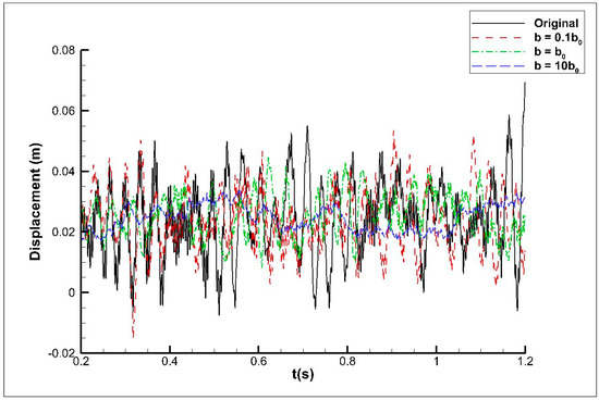 The power spectral density distribution of the wing tip displacement response is shown in Figure 16, which provides a more intuitive understanding of the damping effect of the active excitation on the buffet response. When the excitation force coefficient is set to b = , there is no obvious response peak.