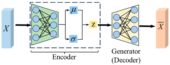 VAE, a variant of the autoencoder, is a neural network that combines probabilistic statistics and deep learning, and its structure is shown in Figure 2. It can be divided into encoder and decoder. Encoder learns the distribution of raw data, converts the original input X into two vectors, one represents the mean vector μ and the other represents the standard deviation vector σ of the distribution. Subsequently, samples are drawn from the sample space defined by the two vectors, and the resulting sample Z, obtained as Z = E(X), is used as the Input for the generator. Nevertheless, training the two values becomes challenging due to the intrinsic randomness of the samples, so the reparameterization technic is utilized to define Z as Equation (1), so that the randomness of the sample will be transferred to ε. The decoder network then restores the hidden variable Z to an approximate reconstructed data.