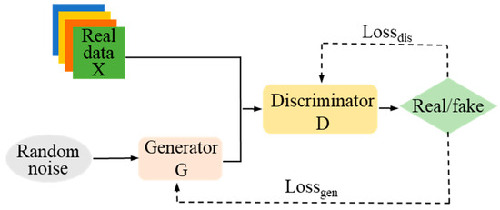GAN is a well-known generative algorithm model that consists of two main components, namely the generator model and the discriminator model. The core concept of GAN is to train generators to generate ideal data through the mutual game between generator and discriminator to form an antagonistic loss. The generator aims to closely align the distribution of the generated samples with that of the training samples, while the discriminator evaluates whether a sample is real, or a fake one produced by the generator. The goal of GAN is to use random noise z to train the generator network, so that the generated samples closely resemble real samples, and the discriminator network calculates the probability that the input samples are from the real samples. The framework of the GAN is illustrated in Figure 3: