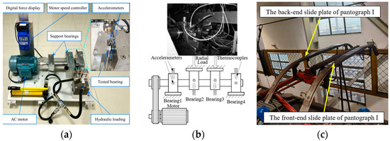 Test bed. (a) XJTU-SY bearing dataset; (b) IMS dataset; (c) Slide plates of pantograph.